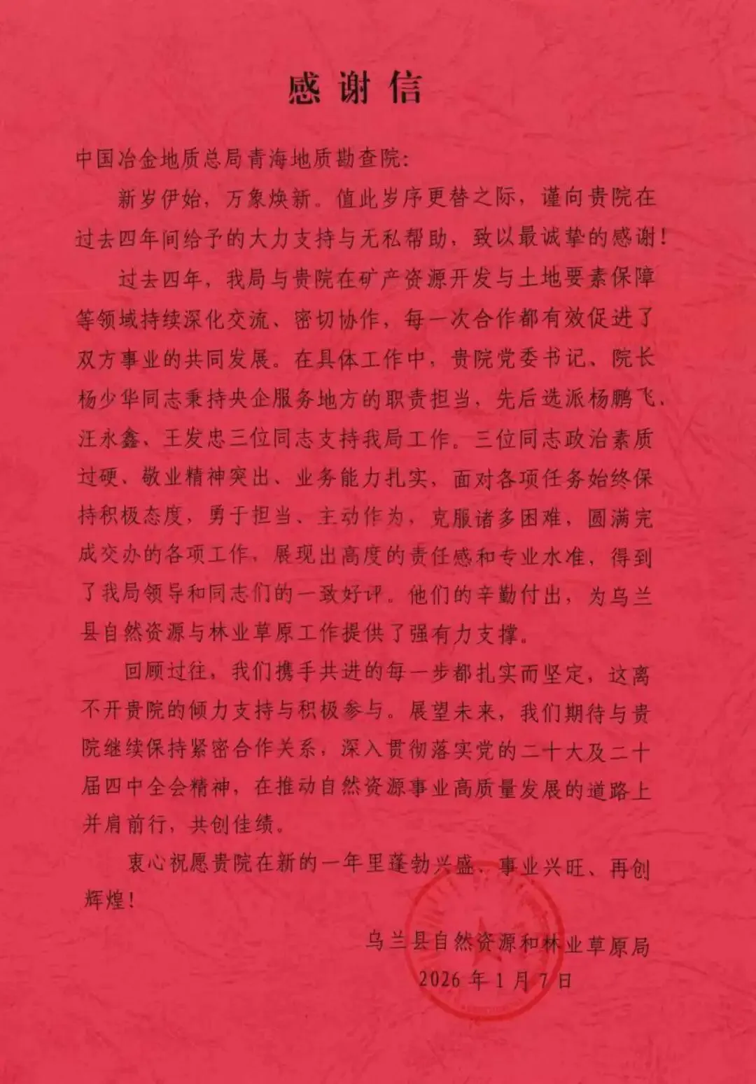 感谢信中高度赞扬了青海地勘院服务地方的责任担当,对选派技术人员的工作成效表示高度认可,并表示期待与青海地勘院(青海科技公司)继续保持紧密合作关系,在推动当地自然资源事业高质量发展的道路上并肩前行、共创佳绩。