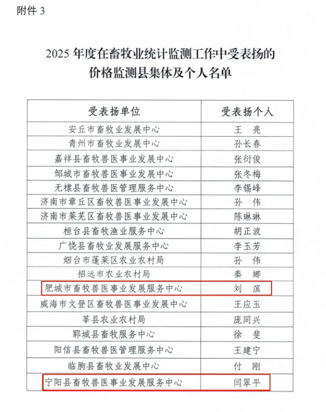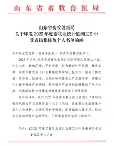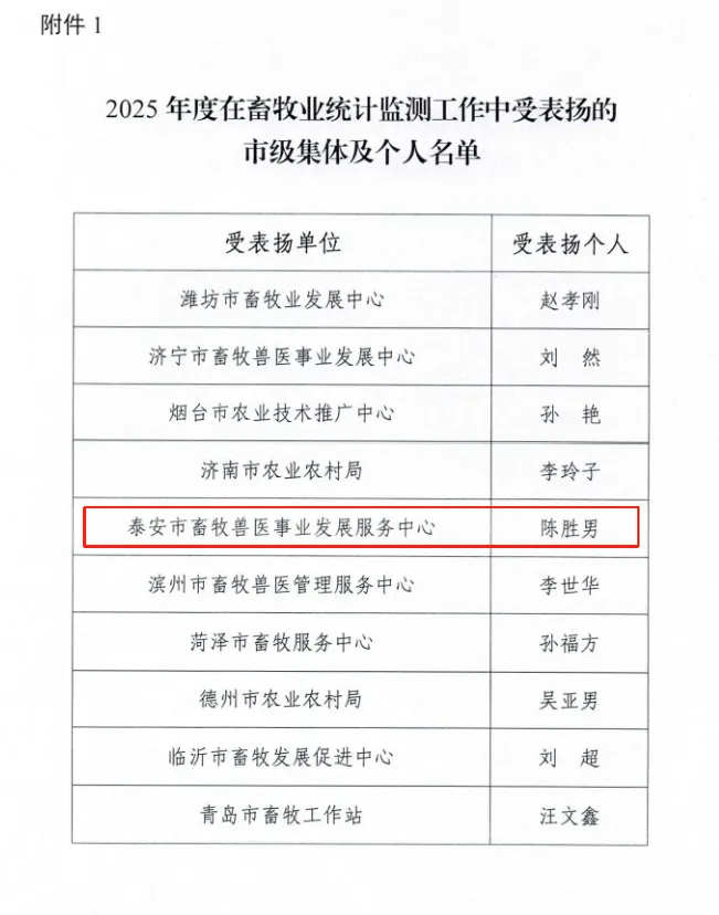 近日,省畜牧兽医局下发《关于印发2025年度在畜牧业统计监测工作中受表扬集体及个人名单的函》,其中,泰安市畜牧兽医事业发展服务中心及肥城市、宁阳县、新泰市3个畜牧兽医事业发展服务中心获评受表扬集体,陈胜男、邢斐、闫翠平、武蕾蕾、刘滨等9人获评受表扬个人。