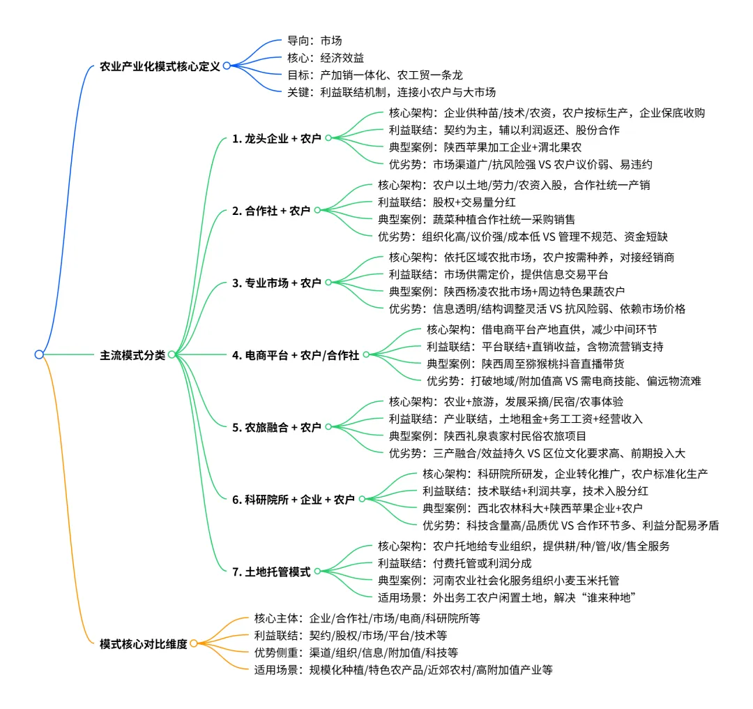 农业产业化模式是指以市场为导向、以经济效益为中心,将农业生产、加工、销售等环节有机结合,实现产加销一体化、农工贸一条龙的经营组织形式,核心是通过利益联结机制,把小农户与大市场连接起来。