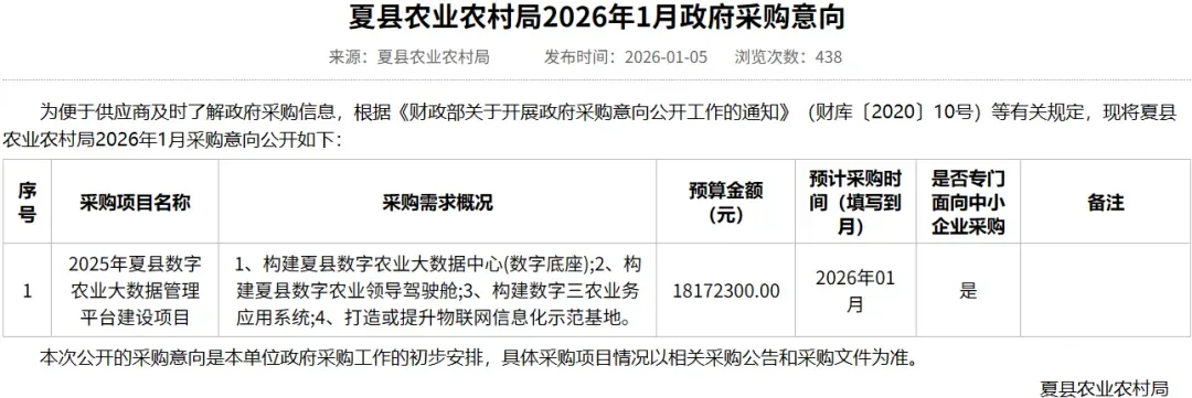 预算1800余万,夏县数字农业大数据管理平台建设项目