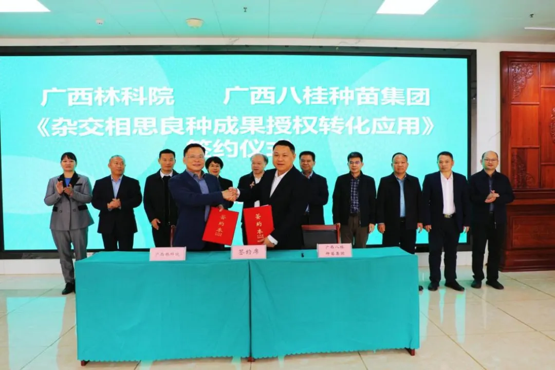 2025年12月30日,广西林科院院长李开祥与广西八桂种苗集团董事长叶家义在东门林场签署科技成果转化协议,将广西林科院将自主选育的“广林杂交相思3号”等4个良种授权广西八桂种苗集团开展全球范围的繁育与推广工作。自治区林业局党组成员、副局长、一级巡视员黄政康,自治区林业局二级巡视员蒋迎红,林场种苗处副处长伍建波,广西大学林学院院长符韵林等领导嘉宾出席仪式。签约仪式由自治区林业局科技处处长伍贤旭主持。正在东门林场就中国工程院战略研究与咨询项目调研优质纸浆原料林培育工作的中国工程院院士王双飞见证签约。