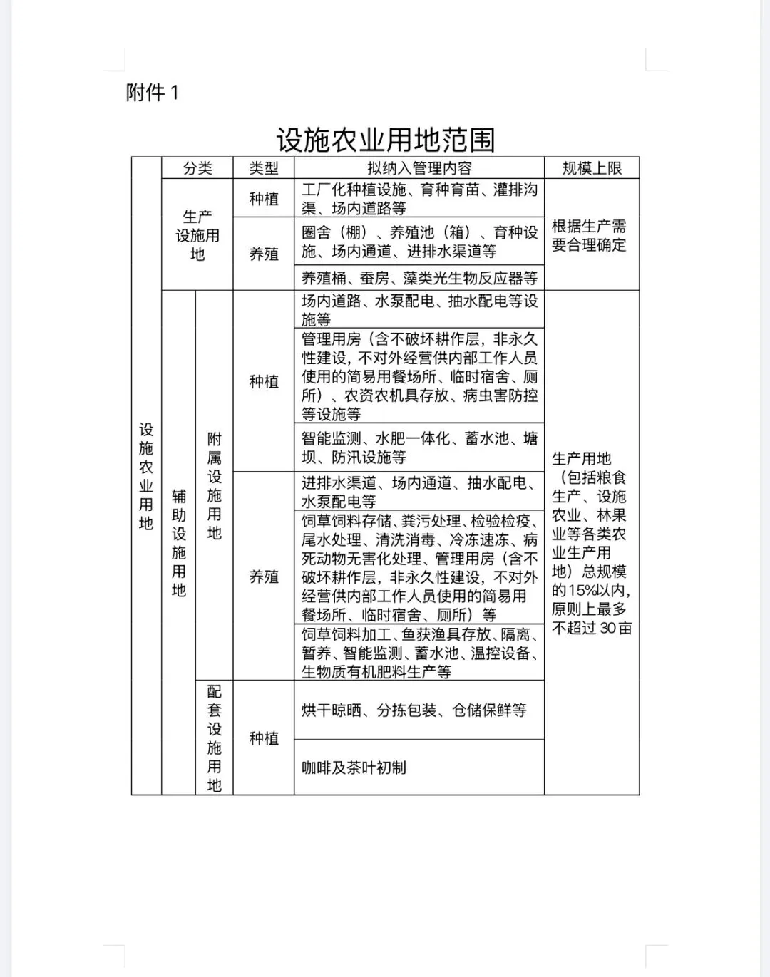 设施农业用地指农业生产中直接用于作物种植和畜禽水产、桑蚕养殖的用地,按功能划分为生产设施用地以及与农业生产直接关联的附属、配套等辅助设施用地(见附件1)。