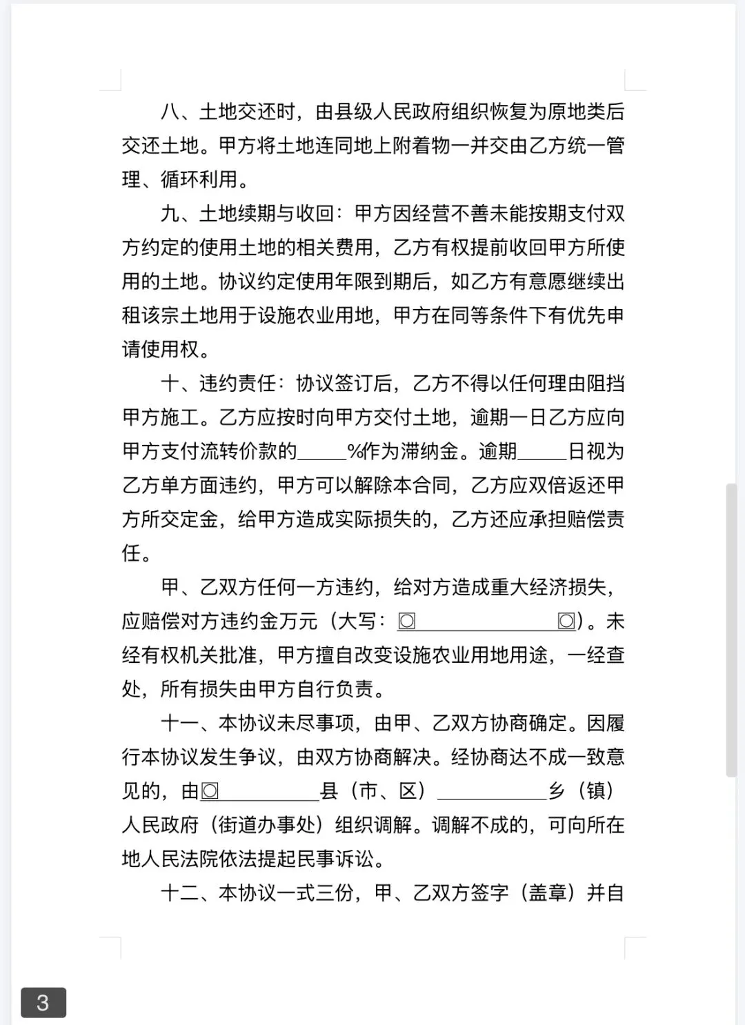 (十二)健全续期、循环使用和恢复机制。设施农业用地备案期限根据土地使用协议确定,不得超过土地承包剩余年限。乡(镇)人民政府应于使用期届满前3个月,提醒经营者及时续期或循环利用。期满需延长使用的,应提前3个月重新签订土地使用协议,提出续期申请。期满或原经营者不再使用的,在不改变农业用途的前提下,经农村集体经济组织和经营者协商同意,地上农业设施可不拆除,将土地连同地上附着物一并交由农村集体经济组织统一管理,需循环再利用的应及时办理变更备案手续。设施农业用地不再使用的,县级人民政府应及时组织恢复原用途,其中,未备案的农业设施用地不再使用的,由经营者恢复。支持具备条件的优先恢复为耕地,经年度变更调查、质量评定符合条件的可用于耕地占补平衡,恢复后,由乡(镇)在监管平台将“生产阶段”更新为“停止生产”并报县级自然资源主管部门纳入年度变更调查。