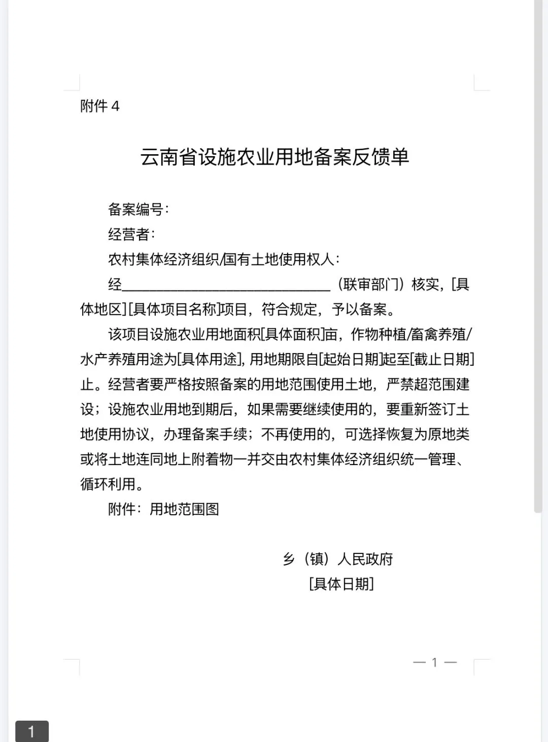 (八)乡镇备案。乡(镇)人民政府作为备案主体,应在5个工作日内完成申请材料审查,符合备案条件的,应当予以备案。备案完成后应当将备案结果及时反馈经营者(见附件4),并将备案信息通过“云南省设施农业用地监管平台”(以下简称监管平台)汇交至县级自然资源主管部门。