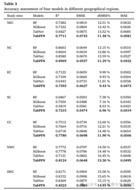 本研究首次将TabPFN 模型应用于生态质量研究,并与SHAP 方法相结合,构建了高效、稳定且具备良好可解释性的分析框架;与RF、XGBoost和TabNet 相比,TabPFN在各区域的预测精度均显著提升,R²提高幅度为6.3%–14.7%。