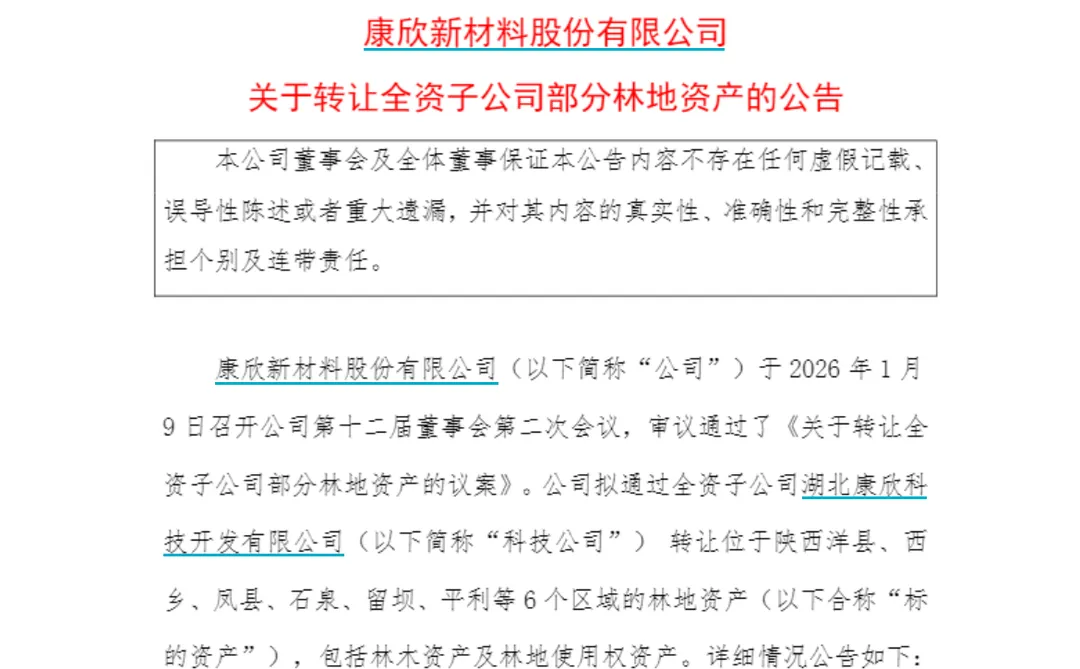1月9日晚,康欣新材(600076.SH)公告称,拟通过全资子公司湖北康欣科技开发有限公司(下称“科技公司”)转让位于陕西洋县、西乡、凤县、石泉、留坝、平利等6个区域的林地资产(下称“标的资产”),包括林木资产及林地使用权资产。