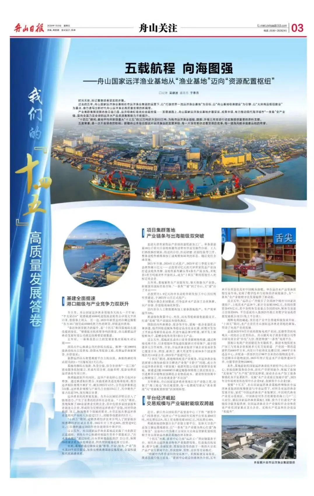 走进2025年9月开放的基地电商产业园,直播带货的吆喝从一间间办公室里传出,舟山捕风电子商务有限公司等13家电商企业“拎包”入驻,组团做强“一条鱼”电商平台。