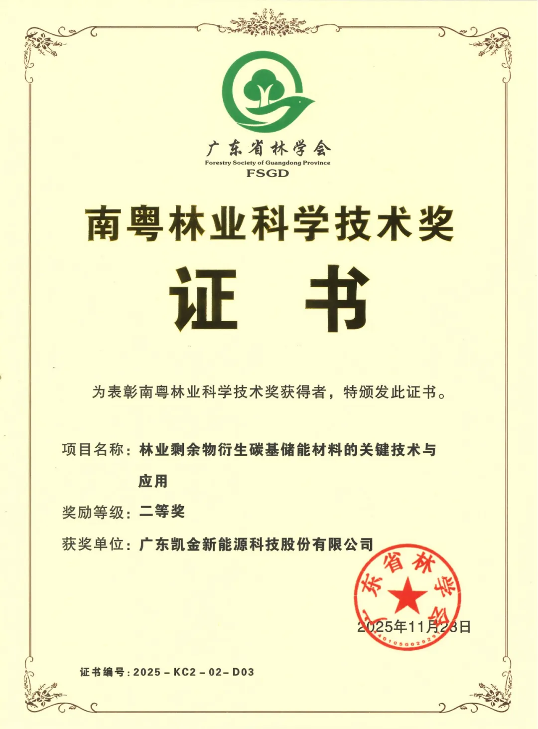 近日,广东省林学会公布了第七届南粤林业科学技术奖评选结果,由会员企业——广东凯金新能源科技股份有限公司(简称“凯金新能源”)参与完成的《林业剩余物衍生碳基储能材料的关键技术与应用》项目荣获科技创新类二等奖。这不仅是凯金新能源在省级科技奖项上的重要突破,更是其在ESG领域持续投入、践行绿色发展的一项关键成果,再次展现了公司通过科技创新驱动可持续高质量发展迈出的又一个坚实步伐。