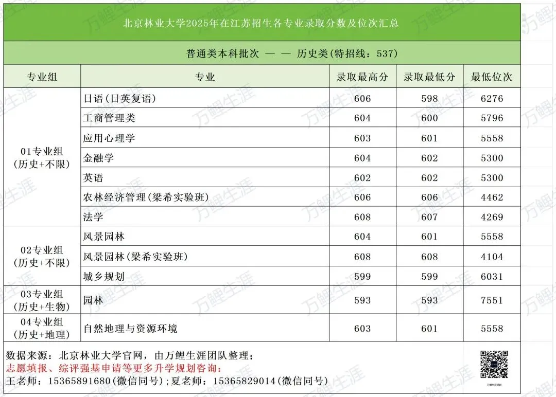历史类最高608分(法学、风景园林【梁希实验班】),最低593分(园林)。