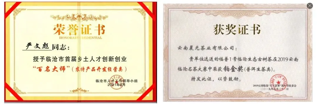 公司董事长严文彪先后担任云县政协委员、常委工商联副主席,获得“捐资助学先进个人”、“国防动员工作先进个人”、“临沧市乡土人才创新创业百名大师”、“云南省特色农产品流通协会会长”等荣誉。公司自成立以来,屡获各级荣誉: