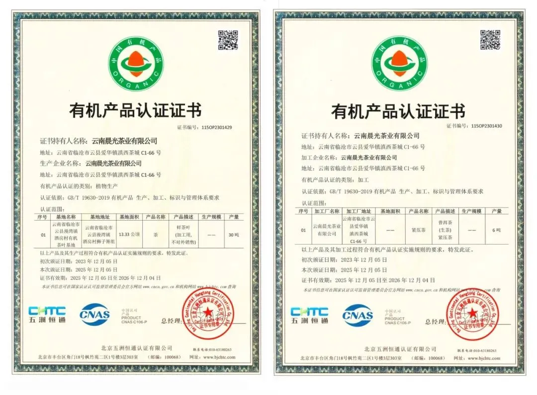 公司茶叶加工中心已取得SC食品生产许可证、有机认证证书。2019年9月20日云南临沧“天下茶尊”茶叶节名茶大赛在临沧落幕,来自中国农科院茶叶研究所、中华全国供销合作总社杭州茶叶研究院、中国茶叶流通协会等单位的14位国内著名茶叶专家分为两组,通过外形评审和内质评审,最终决出8名铂金奖、16名金奖和24名特优奖。我公司生产的临普1号生态古树茶在云南临沧市政府举办2019年9月20日,名茶大赛中,在所有参赛品牌中以9.45分的最高分荣获普洱茶铂金奖。
