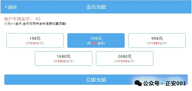 金币充值支付:先进行金币充值,推出有198元(共328金币)、398元(668金币)、998元(1998金币)等多种充值方式(2年内有效),1个金币相当于1元,金币置顶信息也是20个金币/天。