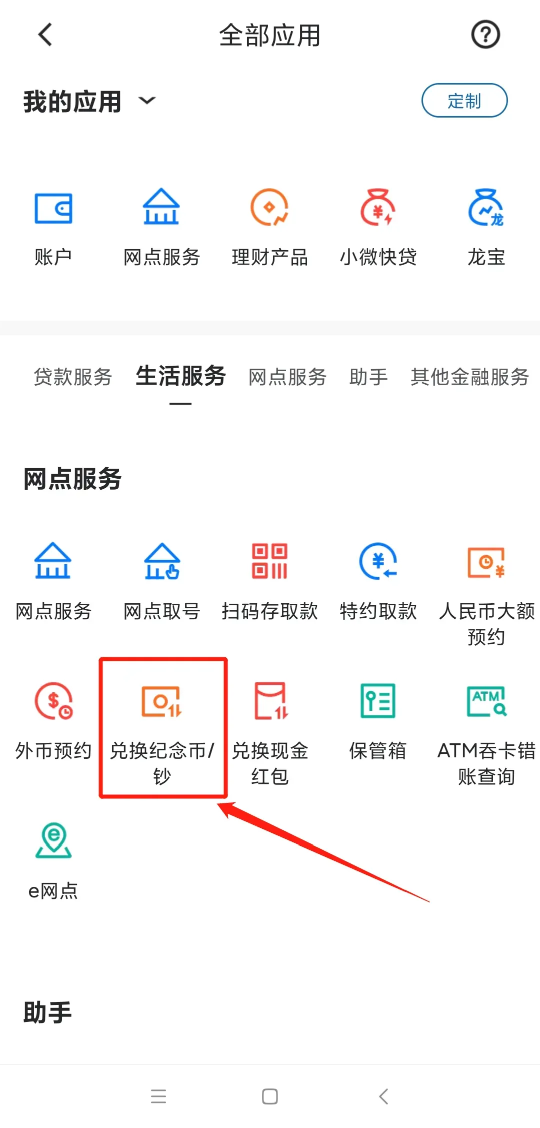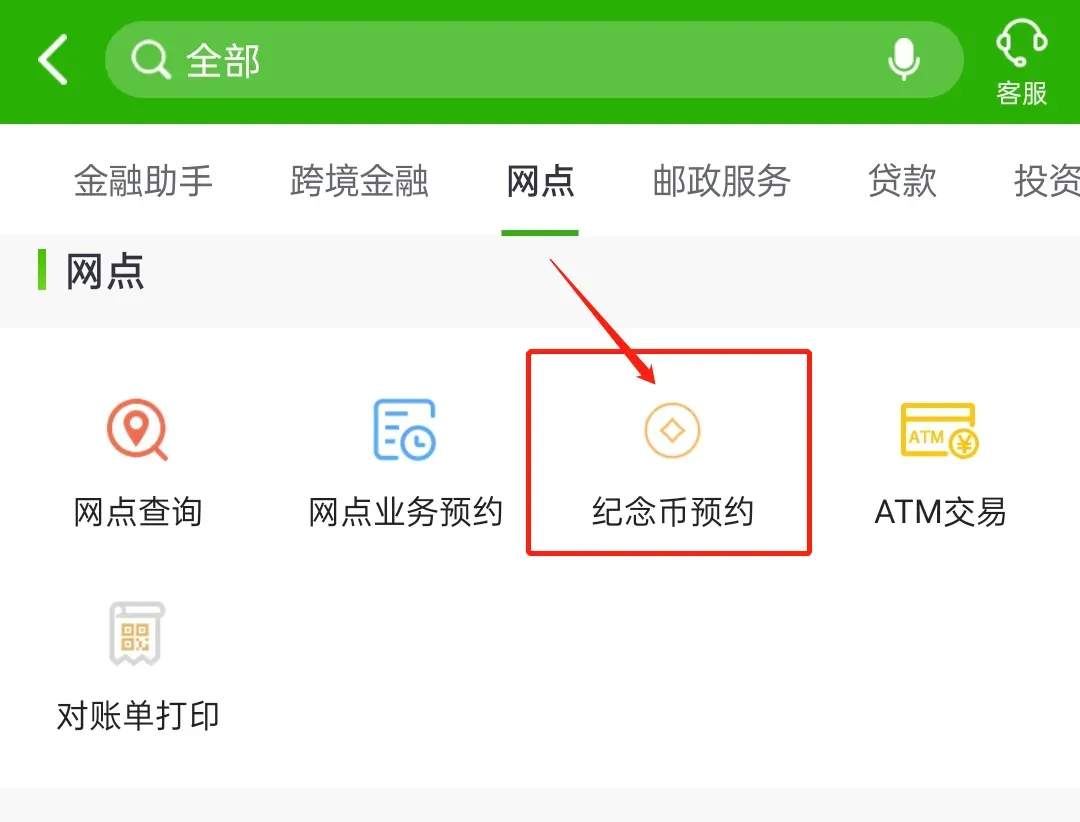 第三步:页面拉到最下方,在“网点”一栏,点击“纪念币预约”图标即可进入。