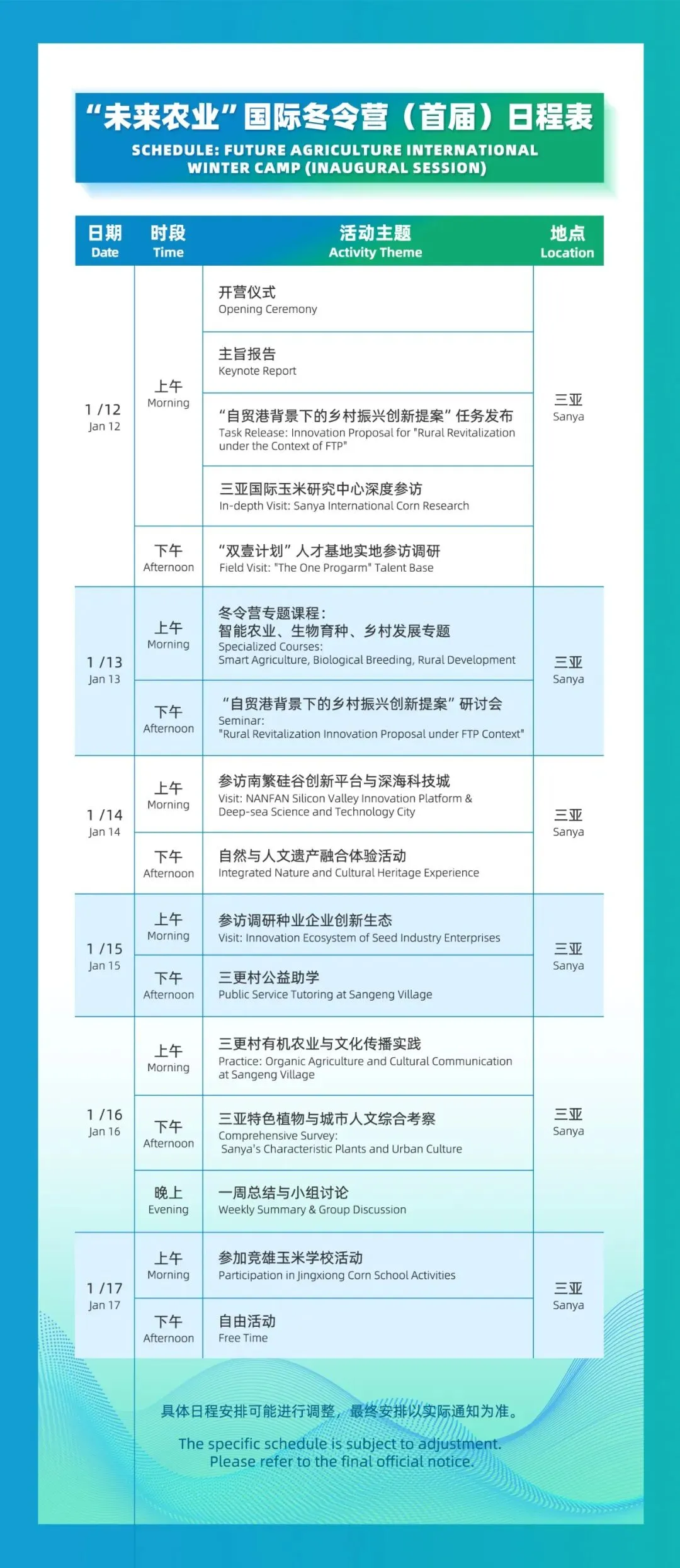 本次冬令营由中国农业大学主办,海南省委人才发展局、海南省农业农村厅、海南省教育厅、崖州湾科技城管理局担任指导单位,中国农业大学国际合作与交流处、研究生院、农学院、三亚研究院承办,中国作物学会人才培养与教育专业委员会、海南大学热带农林学院、海南大学崖州书院协办,其中开营仪式及系列讲座,面向崖州湾科技城感兴趣的师生开放!