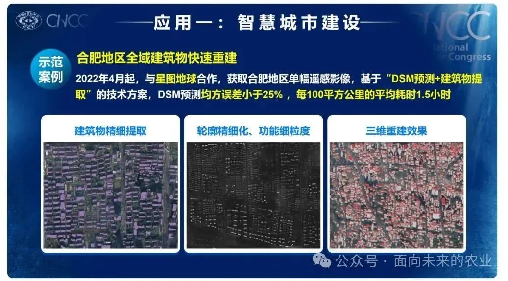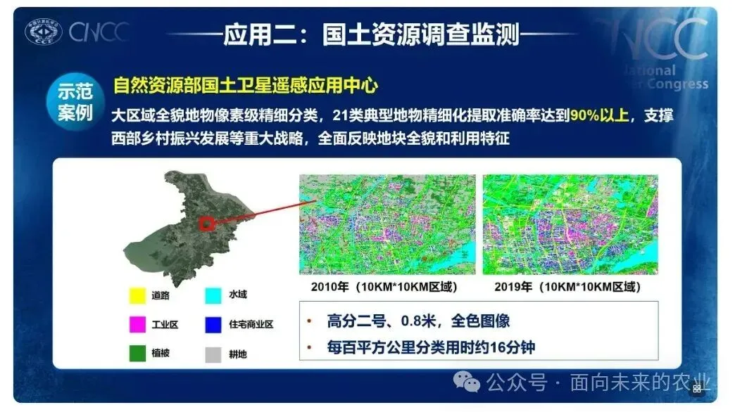 1、农业与粮食安全:耕地地块识别与监测、主要作物(水稻/小麦/玉米/大豆)分布识别、非农化与非粮化监测(如监测园地、大棚、建筑等40余类地物)、农业补贴监管与信贷支持。2、自然资源监测与管理 :土地利用分类与变化检测、常态化自然资源执法(如在广东、广西等地监测土地用途变更,效率提升数倍)、森林、水体、湿地等生态资源调查。3、智慧城市与规划:城市变迁与发展监测、道路与建筑等基础要素提取、违法建设行为检测、辅助城市交通规划与电子地图生产。4、金融与保险:农业保险(提供精准的耕地与作物数据)、绿色金融(支持环境表现相关的投融资决策)。5、环境保护与能源:光伏屋顶普查、机场活跃度监测、裸地扬尘监测、水体、湿地等生态环境监测。转自农业数字化