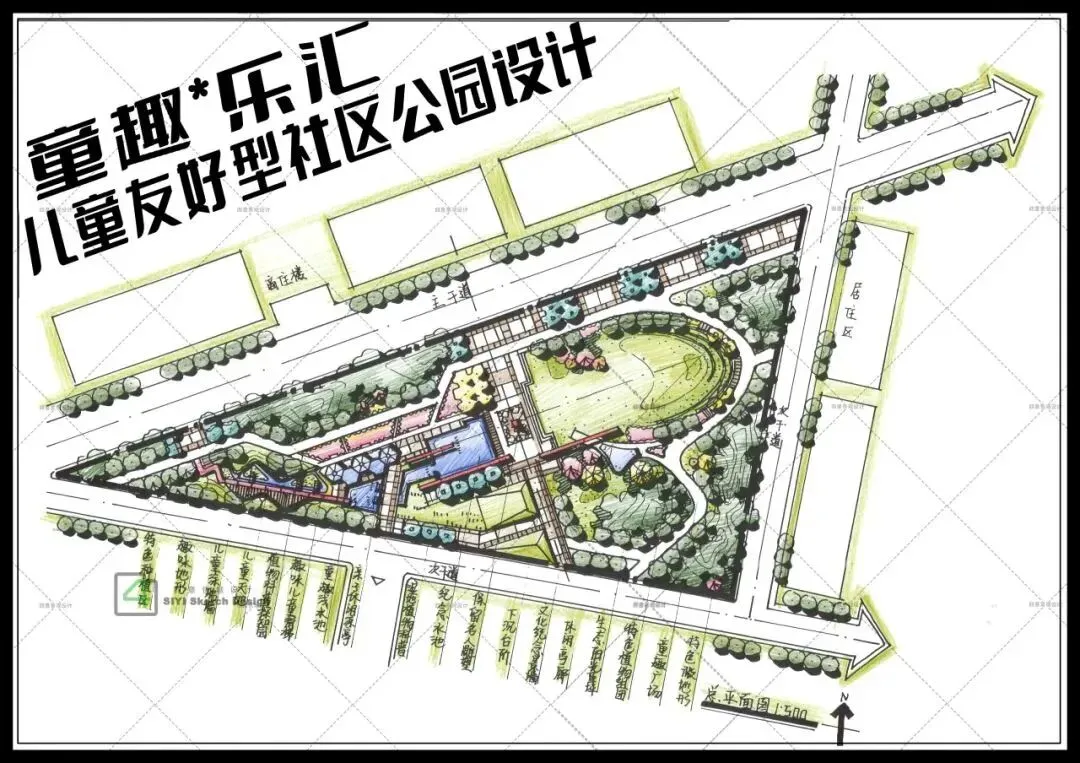 设计需结合不同人群需求,满足各年龄段的功能需求,设置不同活动区例如运动区篮球场,儿童活动区,安静休闲区等。同时设置一个非机动车停车场满足交通要求。