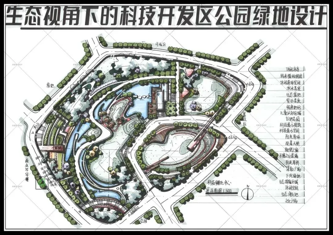 公园绿地率约60%左右,内容设施需满足我国现行《公园设计规范》相关要求。