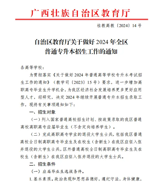 根据《自治区教育厅关于广西普通高等教育专升本考试招生工作实施办法的通知》以及《自治区教育厅关于做好2024年全区普通专升本招生工作的通知》两个权威文件,广西研兴专升本老师整理出广西普通(统招)专升本各专业对应报考指南,供考生复习备考前提前查阅,