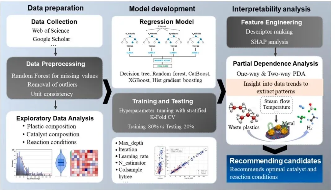 传统气化、热解工艺存在焦油多、能耗高的问题,“热解 + 在线催化重整” 两步法虽有优势,但催化剂设计与工艺参数组合复杂,传统试错法难以实现全局优化。树基机器学习模型可精准捕捉热转化系统的非线性关系,在生物质等领域应用效果显著,却在过渡金属基催化剂辅助的塑料制氢领域尚未充分发挥多因素耦合优化作用,存在研究缺口。