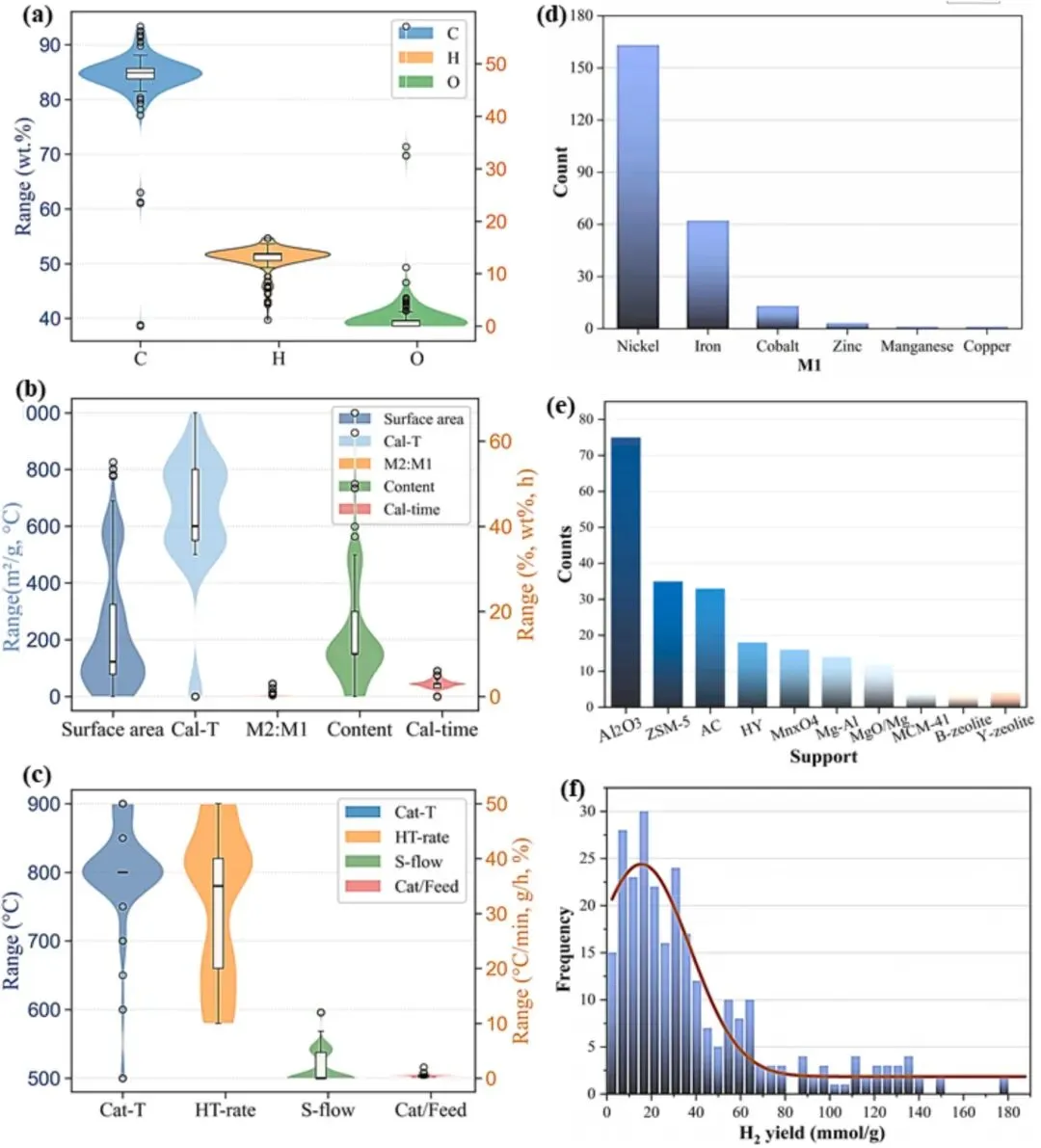图2.(A)塑料组成、(B)催化剂性能和(C)操作条件、(D)活性金属数据点、(D)载体数据点、(E)氢产率数据频率的不同参数的统计分布