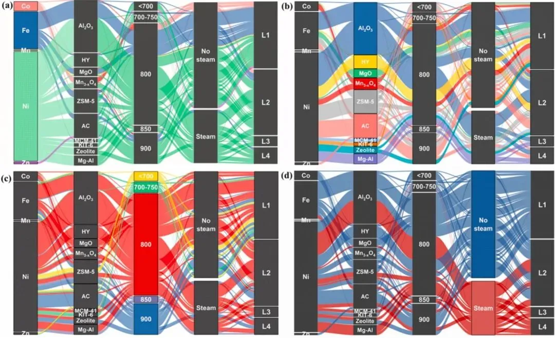 图 4 通过颜色编码可视化不同特征对塑料废弃物热解 - 催化制氢转化率影响的对比图,核心用于直观呈现活性金属、载体、反应温度、蒸汽流量四大关键因素与氢气(H₂)产率的关联规律,为催化剂选型和工艺参数优化提供直接视觉参考