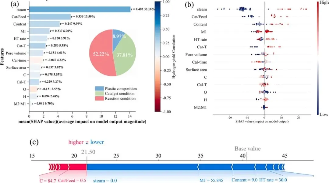 3.精准识别关键影响因素:通过 SHAP 分析确定蒸汽流量、金属负载量、催化剂与原料比是影响氢气产率的三大核心因素(合计贡献 57.44%),颠覆了传统认知中反应温度为首要影响因素的观点,为优化方向提供了明确指引。