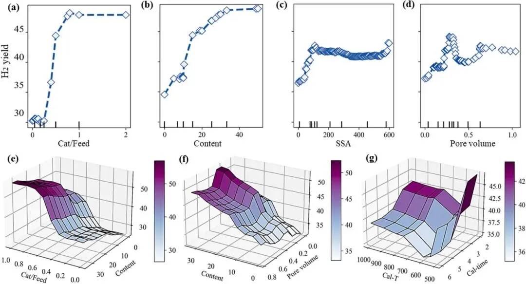 图7催化剂参数对氢产率影响的单向(a-d)和双向(e-g)PDP,特征值从第1到第99百分位数:(A)Cat/Feed,(B)含量,(C)SSA,(D)孔体积,(E)Cat/Feed与含量,(F)含量与孔体积,(G)Cal-T与Cal-Time
