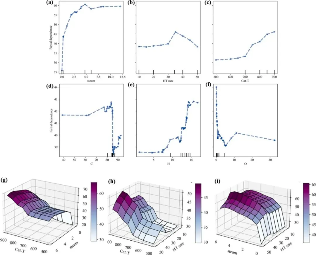 图8.操作参数对氢产率影响的单向(a-f)和双向(g-i)PDP,特征值从第1到第99百分位数:(A)蒸汽,(B)HT率,(C)Cat-T,(D)C,(E)H,(F)O,(G)Cat-T与蒸汽,(H)Cat-T与HT率,(I)蒸汽与Cal-Time