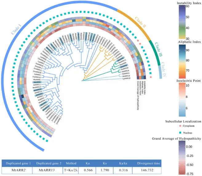 图1. 跨多个植物物种的B型ARR蛋白的种间系统发育分析和理化性质表征。MtARRs的系统发育树是使用MEGA v7.0软件通过最大似然法(ML)构建的,并进行了1000次自举重复,包括来自蒺藜苜蓿、紫花苜蓿、拟南芥、玉米、水稻和多年生黑麦草的B型ARRs。中央蓝色背景表示MtARRs的成员,不同颜色的分支代表不同的B型ARRs亚家族,ARR的ID根据先前的研究命名。最外圈表示家族分类,不同的亚家族显示不同颜色的聚类分支。不同颜色的方形网格表示不同成员的理化性质和亚细胞定位位置。底部表格显示了重复基因的Ka/Ks值。