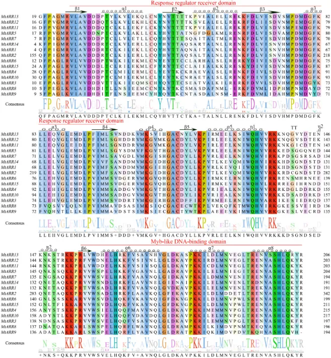 图2. B型MtARRs蛋白的多序列比对。 最保守的结构域用相同颜色和更高的一致性标记。α螺旋显示为黑色螺旋。延伸链显示为黑色箭头。“η”代表无规卷曲,“TT”代表β转角。