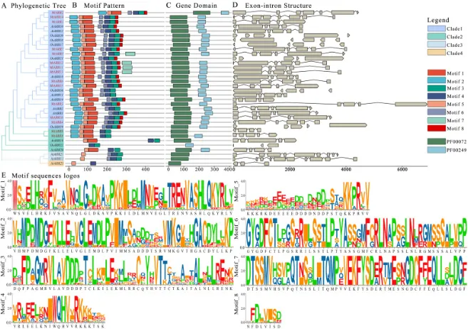 图3. 蒺藜苜蓿中B型MtARRs家族成员的基序组成、保守结构域和基因结构分析。 (A) 使用邻接法和1000次自举重复构建的B型MtARRs种内系统发育关系,分支颜色区分不同进化枝。(B) 15个B型MtARRs的功能基序组成。8个基序由不同颜色的矩形框表示。(C) MtARRs中功能保守结构域PF00072和PF00249的组织结构,分别由深蓝色和深青绿色框表示。(D) MtARRs的内含子-外显子组织结构。内含子和外显子分别由断裂线和棕色框表示。(E) 已鉴定基序的序列标识图,图中彩色字母的大小代表相应氨基酸在该基序中的出现频率,字母越大,频率越高。
