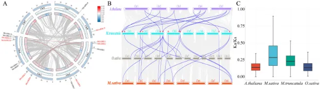 进化关系:种间共线性分析显示,蒺藜苜蓿与紫花苜蓿具有高度共线性,与拟南芥也存在大量直系同源对,而与水稻的共线性关系则很少,凸显了双子叶和单子叶植物之间的显著进化分歧(图4 B)。