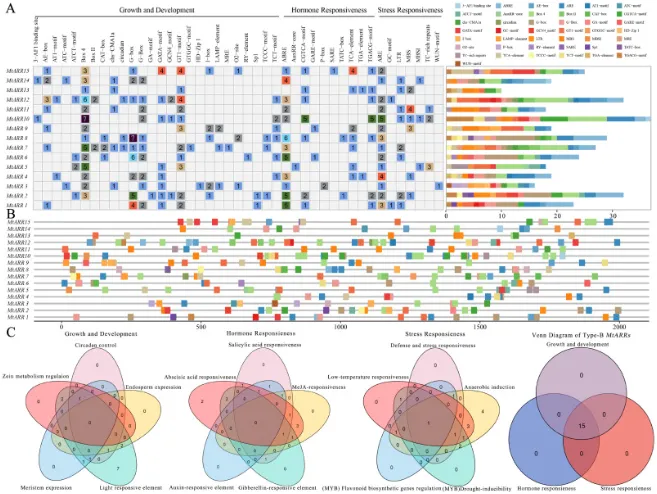 图5. 蒺藜苜蓿中B型ARRs基因家族顺式作用元件的综合分析。 (A) 每个MtARRs中顺式作用元件的数量和功能分类。图中展示了在每个MtARRs中鉴定出的43种顺式作用元件的分布;元件由不同颜色的方框表示。(B) 所有15个MtARR基因2000 bp启动子区域内顺式作用元件的定量分布,显示了位置偏好和聚类模式。综合图例用颜色编码显示了所有43种元件类型。(C) MtARRs的维恩图,展示了三大功能类别(生长/发育、激素信号和胁迫响应通路)中顺式调控元件的重叠和特异性,揭示了调控的复杂性和潜在的串扰。