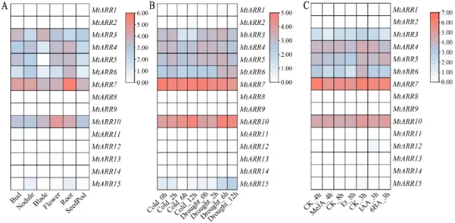 组织特异性:公共转录组数据显示,15个MtARR基因在六种发育组织中表现出显著不同的表达模式,如MtARR7在根中特异性高表达,MtARR10在花中高表达(图6 A)。