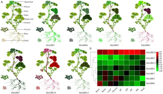 RT-qRCR进一步验证了MtARR3/4/5/6/7/10/15在蒺藜苜蓿不同组织中的表达模式,结果表明这些基因广泛表达但具有不同的时空表达模式,并可大致分为三类(图7 A, B)。