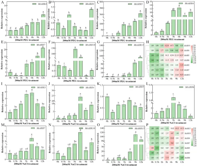 图8. MtARR基因在非生物胁迫条件下的时间表达谱。 七个代表性MtARR基因(MtARR3/4/5/6/7/10/15)在(A-G) 200 mM聚乙二醇(PEG)处理诱导的干旱胁迫和(I-O) 200 mM NaCl处理诱导的盐胁迫下,在12小时时间进程(0、0.5、1、3、6、9和12小时)中的定量RT-PCR分析。相对表达水平使用2-ΔΔCt方法计算,以MtActin为参考基因,并对0小时对照进行归一化。误差棒代表三个生物学重复的标准误。条形图上方的不同字母表示统计学上的显著差异(p < 0.05,单因素方差分析后进行邓肯多重范围检验)。(H, P) 分别显示了七个MtARR基因在干旱和盐胁迫条件下的共表达关系的相关性矩阵。颜色强度和数值代表皮尔逊相关系数,红色表示正相关,绿色表示负相关。