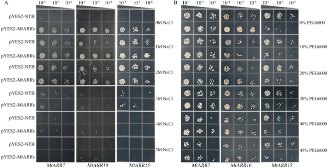 图10. 通过酵母异源表达对MtARRs胁迫耐受性的功能验证。 转化了pYES2-NTB(空载体对照)或pYES2-MtARRs(MtARR7、MtARR10、MtARR15)的酿酒酵母INVSC1菌株在(A)盐胁迫条件(0–5 M NaCl)和(B)渗透胁迫条件(0–45% PEG6000)下的生长性能。酵母培养物经过系列稀释(10⁻⁴、10⁻⁵、10⁻⁶)后,点样于补充了半乳糖以诱导蛋白表达的SD/-Ura选择性培养基上。