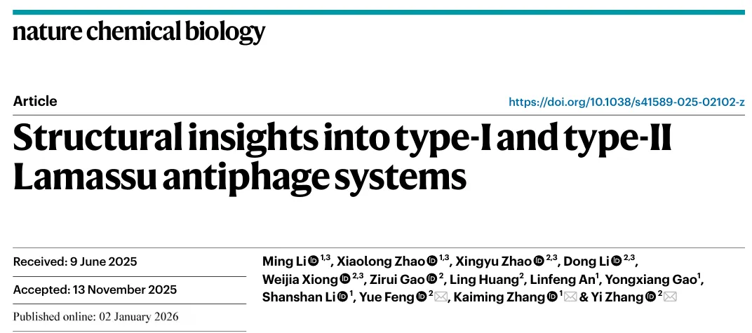近日,北京化工大学冯越教授与张怡副教授团队携手中国科学技术大学生命科学与医学部张凯铭教授团队,在《Nature Chemical Biology》上发表了一项重要研究成果,题为《Structural insights into type-I and type-II Lamassu antiphage systems》。这是冯越教授作为通讯作者在该期刊上发表的第四篇论文。研究通过解析I型和II型Lamassu抗噬菌体系统在多种功能状态下的高分辨率冷冻电镜结构,并结合体外生化实验与噬菌体防御功能验证,首次完整揭示了这一“细胞自杀”防御机制如何被精准调控。值得一提的是,冯越教授早在2012年,尚在清华大学攻读博士学位期间,就以第一作者发表了个人首篇《Nature》论文。2018年,其课题组在《Nature》上发表的研究成果,成为北京化工大学校史首篇《Nature》论文;2023年,又发表了校史首篇《Cell》论文;2024年和2025年,冯越团队再度于《Nature》和《Cell》刊发重要研究成果。点击阅读: