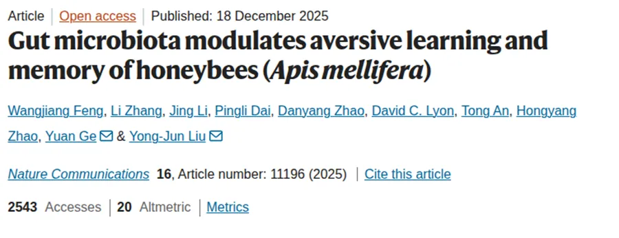 [1] Feng, W., Zhang, L., Li, J. et al. Gut microbiota modulates aversive learning and memory of honeybees (Apis mellifera). Nat Commun 16, 11196 (2025). 本文内容均为个人学习看法,如若侵权或异议,联系即删!
