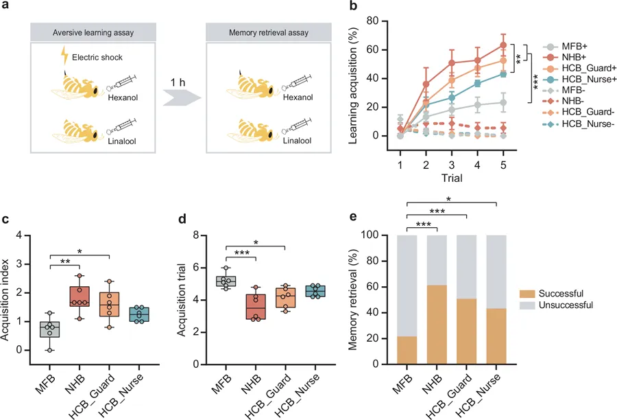 研究首先确证了肠道菌群在蜜蜂厌恶性学习与记忆中的关键作用。通过比较无菌蜜蜂(MFB)和正常蜂巢蜜蜂(NHB),发现MFB在与电击相关的气味联想学习任务中表现出显著缺陷,其学习获得率和记忆保持率均远低于NHB。重要的是,这种缺陷并非源于其天生防御反应或对电击敏感性的差异。通过将守卫蜂的后肠微生物移植给MFB,其受损的学习记忆能力得到了显著恢复,这表明肠道菌群的存在是维持正常厌恶性学习功能的必要条件。