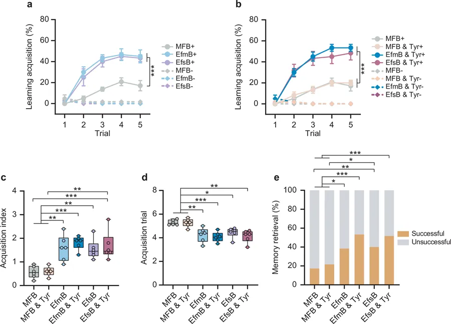 图4 口服补充粪肠球菌可调节蜜蜂的厌恶性学习和记忆为了鉴定发挥关键作用的特定菌株,研究者从蜜蜂肠道中分离出粪肠球菌(Enterococcus faecium)和屎肠球菌(Enterococcus faecalis),并将它们分别定植到MFB中。结果惊人地发现,这两种非核心菌的单菌定植就足以完全恢复MFB的厌恶性学习和记忆能力。进一步实验表明,单独为MFB补充酪氨酸无效,但为单菌定植的蜜蜂补充酪氨酸后,其脑部多巴胺水平显著升高,学习记忆能力也得到巩固。这证明了粪肠球菌等细菌是连接膳食酪氨酸和脑部多巴胺水平的关键代谢中介。