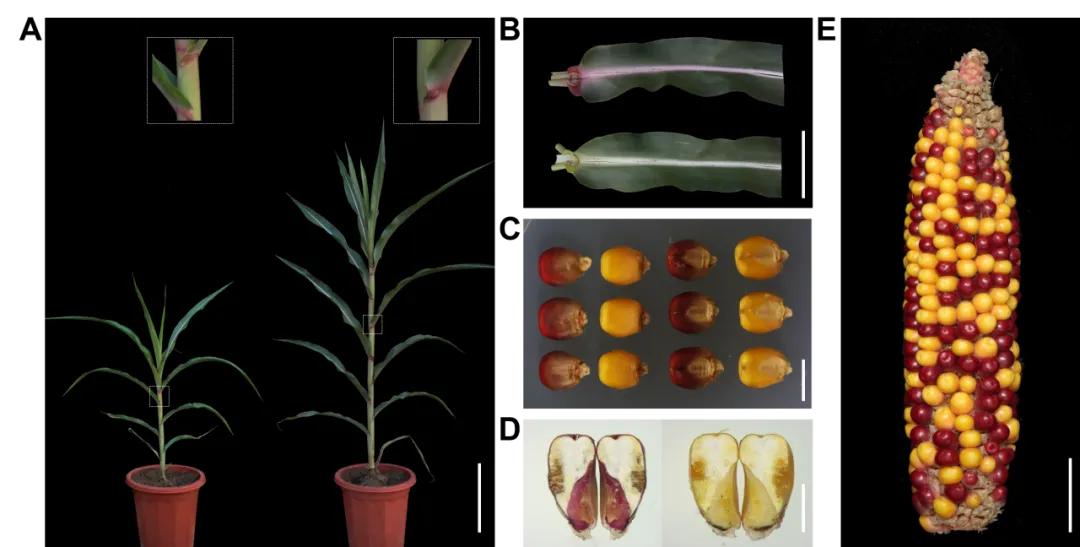 在实际验证中,ASPT系统表现出优异的性能。本研究将该系统成功导入21个遗传背景各异的玉米优良自交系,育性基因的编辑效率达100%,且RUBY标记在不同自交系及多世代遗传中表达稳定。在种子分选环节,使用色选机处理红、黄各半的混合群体,分选准确率达99.81%,每小时可处理20万粒种子。进一步将机器挑选出的不育系种子种植田间,杂株率仅为0.05%,并可凭借叶耳与叶脉的红色标记在散粉前实现对杂株的精准识别与完全剔除,显著提升了制种纯度和操作便利性。