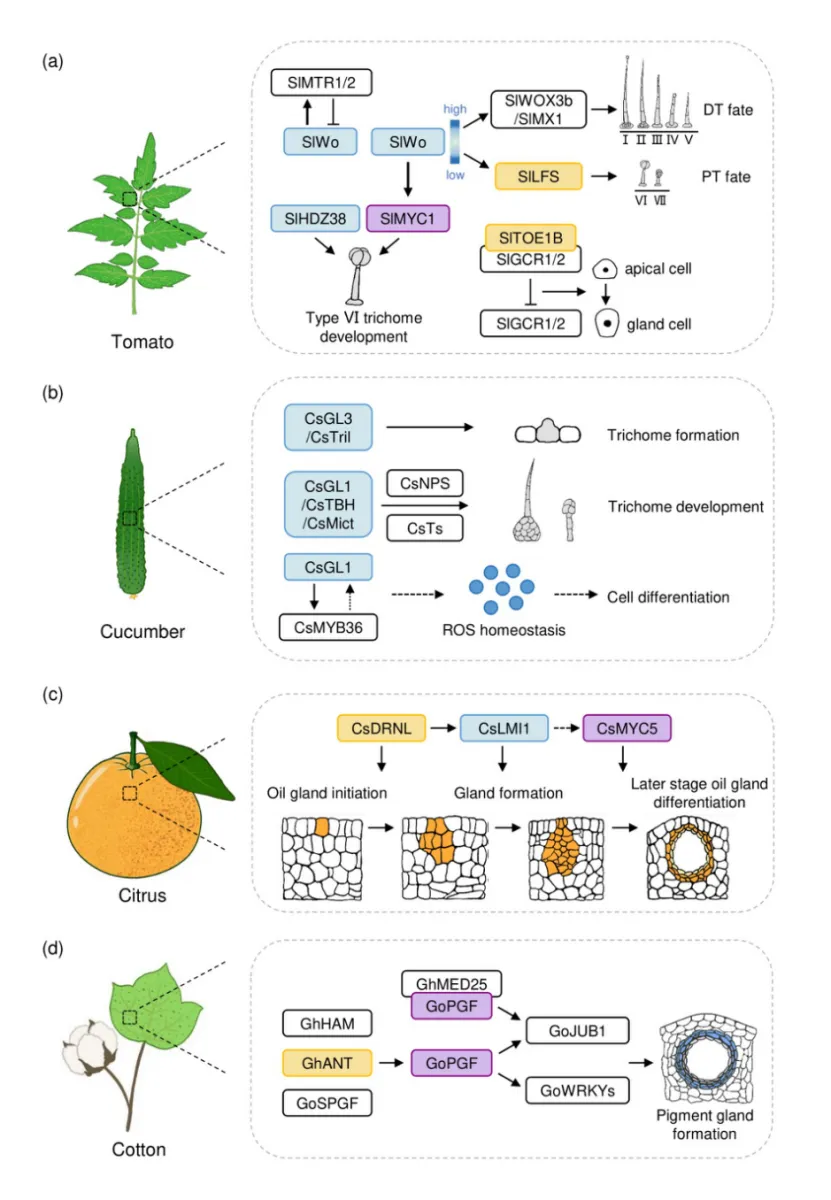 2026年1月9日,华中农业大学园艺林学学院、果蔬园艺作物种质创新与利用全国重点实验室邓秀新院士和张飞教授团队应国际知名期刊《New Phytologist》邀请,在线发表了题为“Plant epidermis-derived secretory structures: from glandular trichomes to secretory cavities”的Tansley insight综述。该论文系统回顾了番茄、黄瓜、柑橘和棉花四种作物近五年在分泌结构研究方面的进展,总结了分泌腺毛和分泌囊的发育及其分泌物质生物合成的分子调控机制,并对该领域未来研究方向进行了展望。