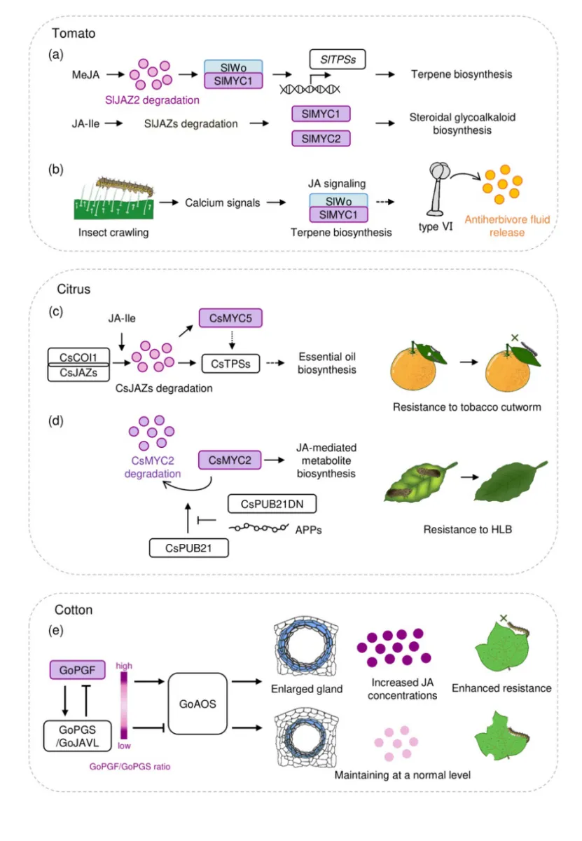 文章指出,HD-ZIP(包括HD-ZIP I 和HD-ZIP IV)和AP2/ERF家族转录因子共同调控表皮来源植物分泌结构的发育起始与形态建成过程,而茉莉酸和MYC家族转录因子对次生代谢产物的生物合成及植物抗病虫能力具有重要调控作用。文章强调,直系同源基因在不同物种中可调控不同细胞、组织或器官的分化;而在同一物种中,旁系同源基因也可在不同组织与器官中发挥相异的功能。这些功能分化的分子基础,如顺式调控元件及蛋白结构域的变异,值得深入探究。未来,关于表皮细胞向内或向外发育的决定机制、次生代谢产物生物合成如何受内源激素及环境因子调控等问题,也将成为重要研究方向。解析分泌结构及其产物的分子调控网络,将为重要分泌物质的高效生物合成奠定理论基础。