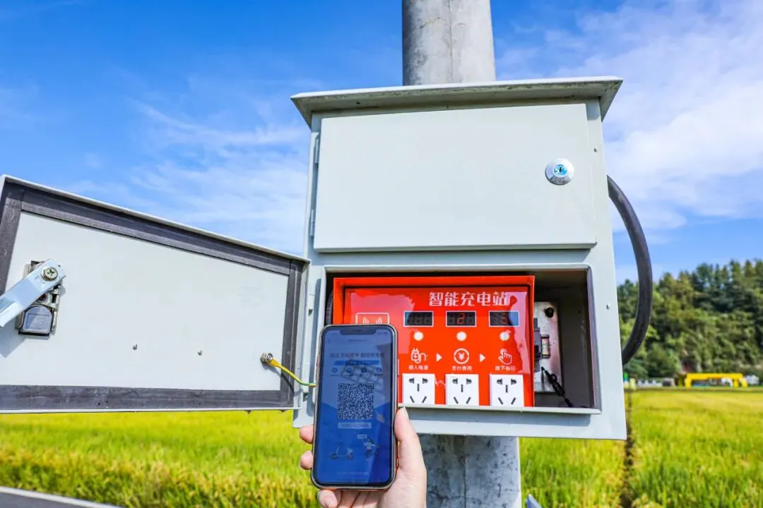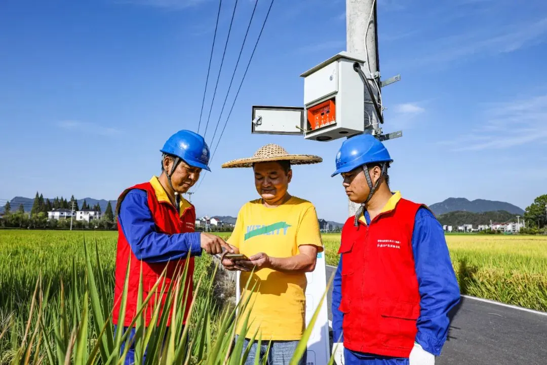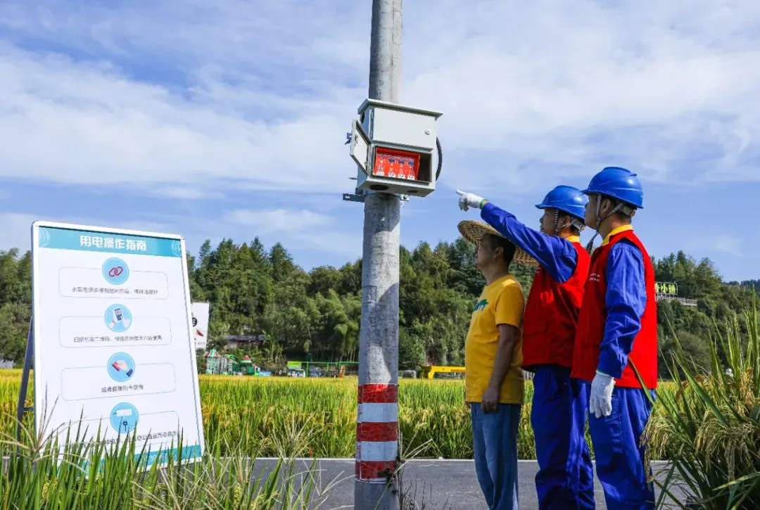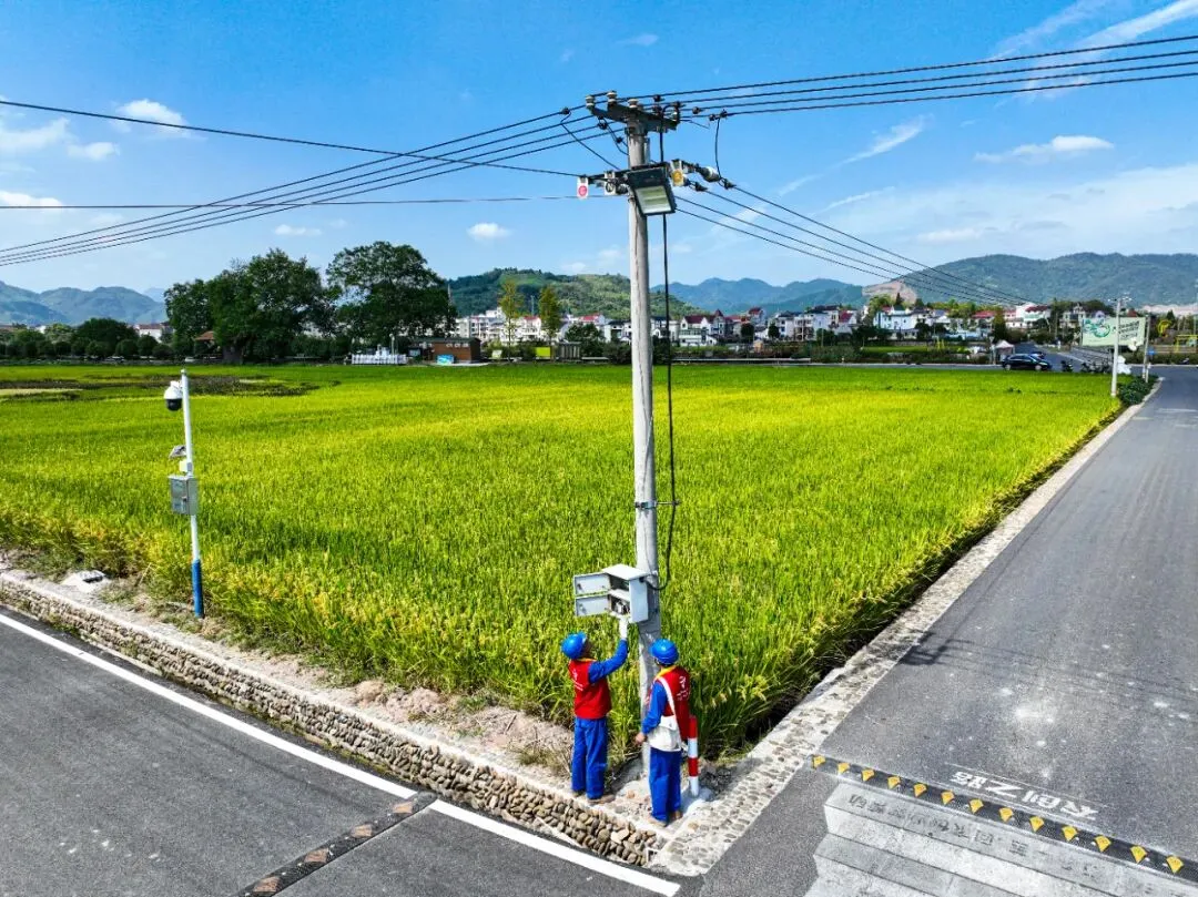 共享电表是表后延伸服务的一个载体。在赋能乡村振兴、共同富裕的发展道路上,共享电表的服务效应辐射了包含村民、村委、供电公司、城乡区域在内的多维主体,形成了“1+N”利益共同体。共享电表用电新模式解决了农业末端用电痛点,省心、省力又省钱。这一用电管理模式的试点扩面有利于区域农业用电“标准化”建设,有效缓解用能高峰期农户用电需求和电力供给之间的矛盾,促进农户集体创收,带动共同富裕。村委采用代收电费、统一管理的治理模式,颗粒化监督管理表计运营,将民生问题的痛、难、堵点“掰开揉碎”,打通了服务群众的“最后一公里”。同时,村纪委的监督效能也在持续扩大,乡村治理体系得到了进一步完善。供电人员在大同稻田边的电杆上安装共享电表智能插座|唐衎 摄供电公司开辟抗旱用电绿色通道,缓解农业灌溉困境,整治农田用电乱象,促成村委化解民生服务管理难题,降下助农纾困“及时雨”,展现了属地央企的责任担当,实现了与乡村发展同频共振的目标。农业的规范化管理有助于区域建设共同富裕示范区,进一步吸引农创人才回乡创业,激励乡村产业振兴的正向循环。乡村富美带动农旅融合,引领乡村风貌提升,擦亮农业特色型美丽城镇金名片,助力推动“宜居建德”落地建设。