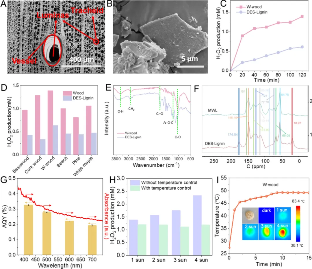 图1. W木的表征。(A) W木的扫描电子显微镜(SEM)图像。(B) 低共熔溶剂木质素(DES-Lignin)的扫描电子显微镜图像。(C) W木和从W木中提取的DES-木质素催化过氧化氢(H₂O₂)生成的比较。(D) W木和从W木中提取的DES-木质素催化过氧化氢生成的比较。(E) W木和DES-木质素的傅里叶变换红外光谱(FTIR)。(F) 从W木中提取的磨木木质素(MWL)和DES-木质素的固态¹³C核磁共振(NMR)谱。(G) W木的表观量子产率(AQY)随波长的变化(蓝色为420纳米,绿色为500纳米,橙色为600纳米,红色为700纳米)。右侧纵坐标对应W木的紫外吸收光谱。(H) 在1至4个太阳光照强度下,W木在有或无20℃温度控制条件下催化过氧化氢的生成情况。(I) 含W木的反应溶液的温度监测。插图是W木在不同强度模拟太阳光照下(1个太阳 = 100毫瓦每平方厘米)的红外(IR)图像。所有实验均在空气中的纯水中进行2小时,光催化剂用量为20毫克每毫升。