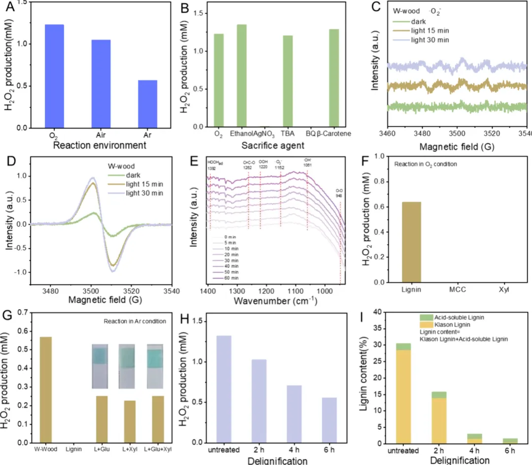 图2.W木的光催化机理。(A) W木在不同气体氛围中催化产生H₂O₂的情况。(B) 添加不同牺牲剂时W木催化产生H₂O₂的情况。(C) W木在光照和黑暗条件下产生·O₂⁻的电子自旋共振(ESR)结果。(D) W木在光照和黑暗条件下的ESR光谱。(E) W木光催化水反应的原位傅里叶变换红外光谱(FTIR)测试。(F) 在O₂条件下,木质素(L)、微晶纤维素(MCC)和D - 木糖(Xyl)光催化产生H₂O₂的比较。(G) 在Ar条件下,W木粉末、L以及添加了D - 葡萄糖(Glu)的L和D - 木糖(Xyl)体系光催化产生H₂O₂的比较。插图为用H₂O₂试纸测量的H₂O₂浓度。(H) 模拟太阳光照(100 mW cm⁻²)下,不同脱木质素程度的W木光热催化产生H₂O₂的情况。插图照片为不同脱木质素程度的W木。插图展示了不同脱木质素程度后W木的颜色。(I) 不同脱木质素程度后W木的木质素含量。