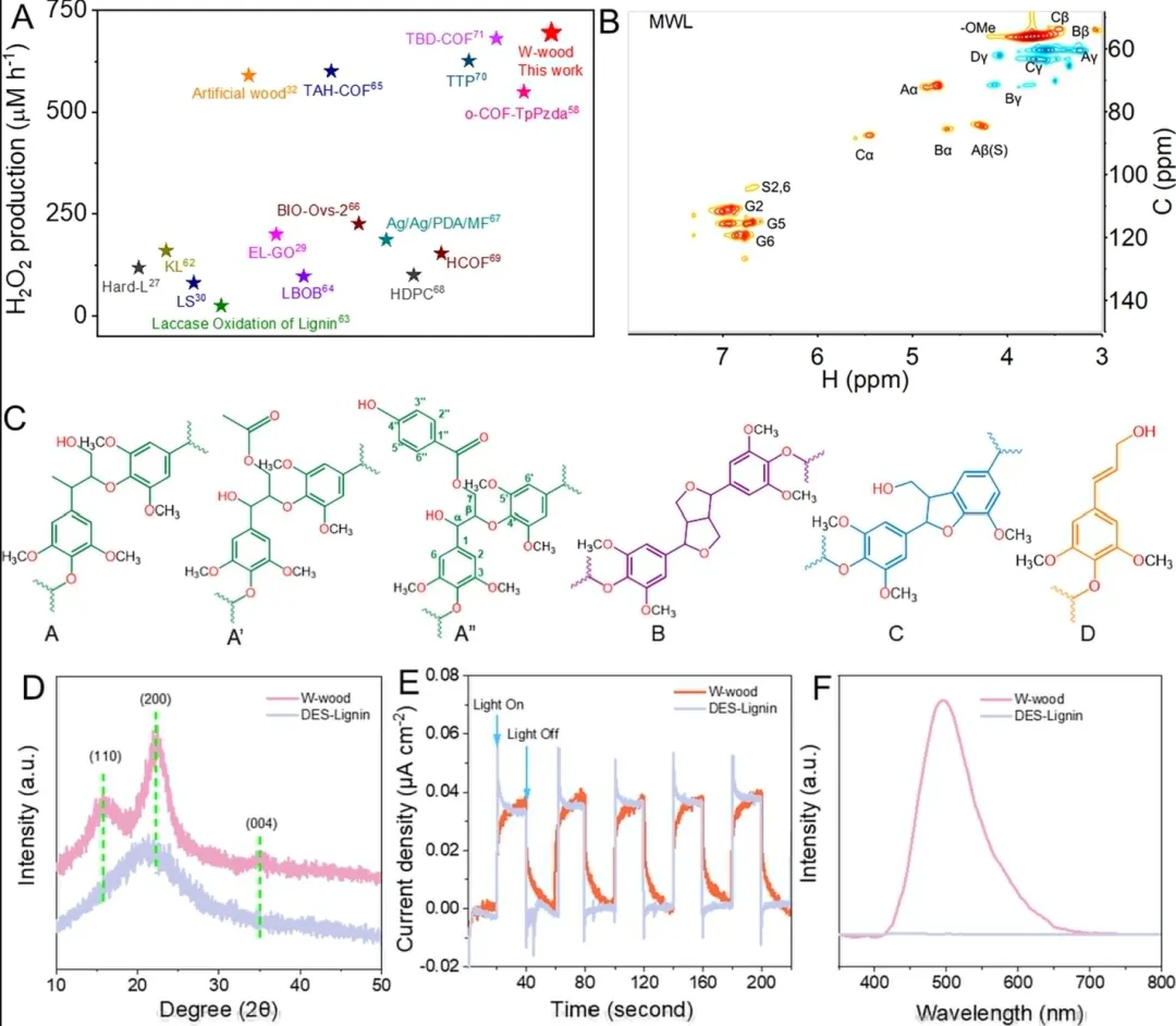 图3.W-木的光热催化机理。(A)W-木与已报道的木质素基和其他光催化剂的活性比较。(B)磨木木素(MWL)的二维异核单量子相干(2D HSQC)核磁共振谱。(C)木质素的主要结构和化学键。(D)W-木及其提取的低共熔溶剂木质素(DES-lignin)的X射线衍射(XRD)图。(E)W-木及其提取的DES-木质素的光电流。(F)W-木及其提取的DES-木质素的室温磷光光谱。
