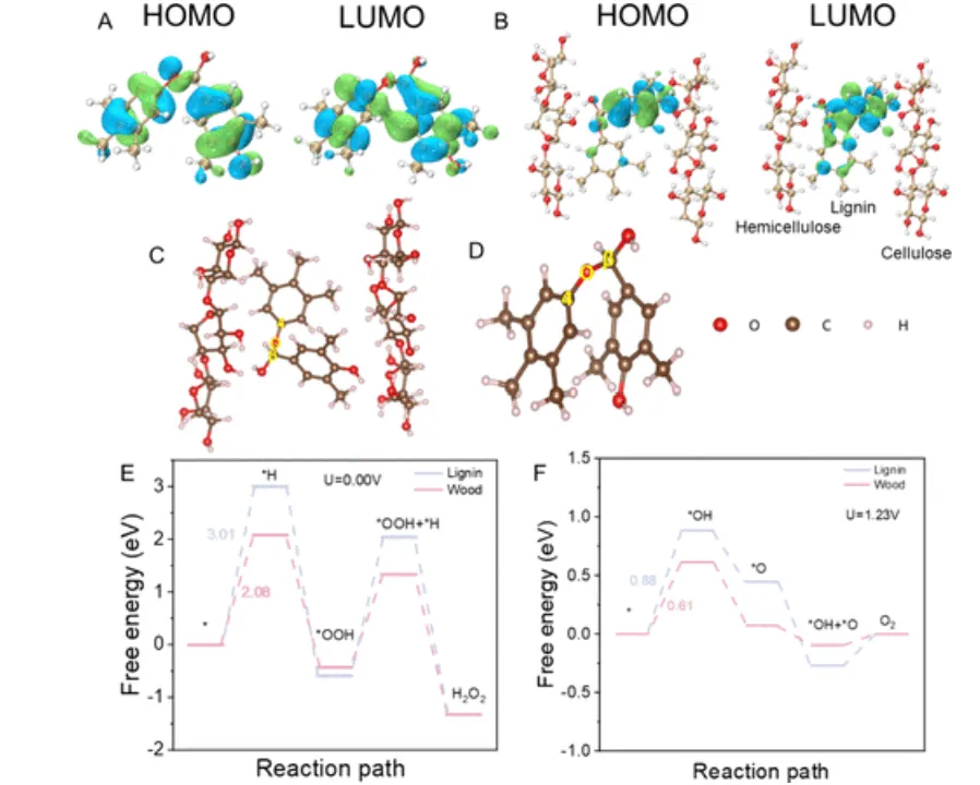 图4.木材和木质素的密度泛函理论(DFT)计算。(A) 孤立木质素的最高占据分子轨道(HOMO)和最低未占据分子轨道(LUMO)能级。(B) 天然木材中木质素的最高占据分子轨道(HOMO)和最低未占据分子轨道(LUMO)能级。(C) 天然木材中木质素的电荷分布图。(D) 孤立木质素的电荷分布图。(E) 木质素和木材上2e– 氧还原反应(ORR)的反应过程对比。(F) 木质素和木材上4e– 水氧化反应(WOR)的反应过程对比。同时还标注了木质素和木材上4e– 水氧化反应(WOR)和2e– 氧还原反应(ORR)的决速步骤(RDS)的ΔG值。