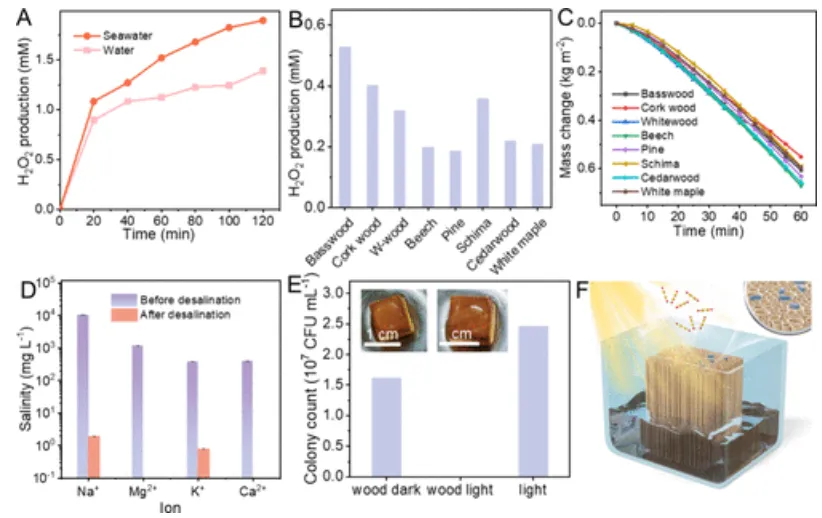 图5.应用。(A) 仿太阳光照射(100 毫瓦/平方厘米,海水取自渤海,经过滤去除悬浮固体和沉积物)下,W 木材料在纯水和海水中的光热催化过氧化氢生成情况。(B) 不同木材在 5 小时内对海水中过氧化氢的脱盐情况。(C) 不同木材作用下海水的质量随仿太阳光照射时间(100 毫瓦/平方厘米)的变化。(D) W 木材料脱盐前后海水中四种主要离子(钠、镁离子、钾钙离子、)的浓度。(E) 在不同环境中培养的大肠杆菌菌落计数(插图为用 W 木材料制成的消毒设备)。(F) 用 W 木材料制成的小型杀菌消毒设备示意图。